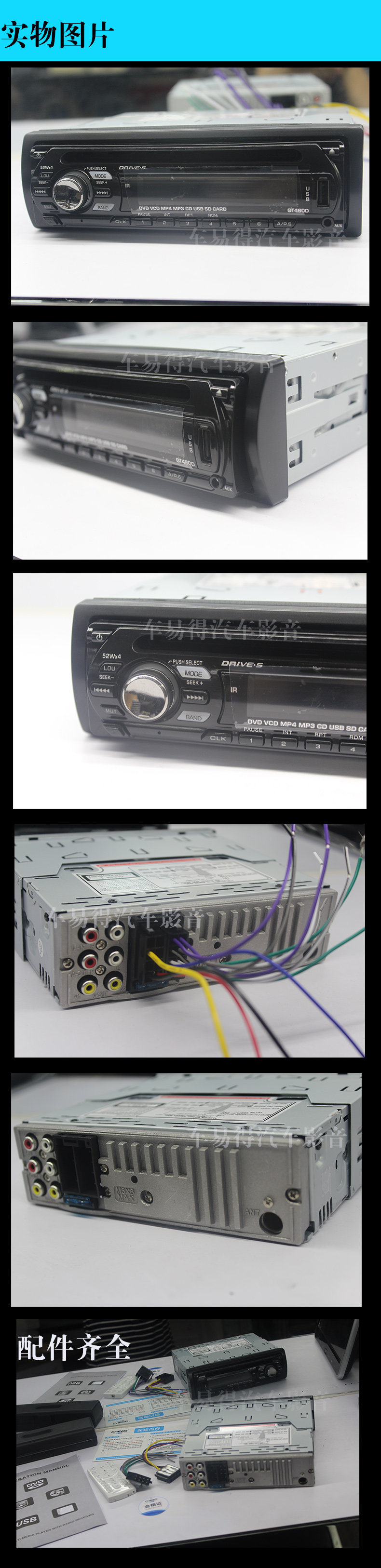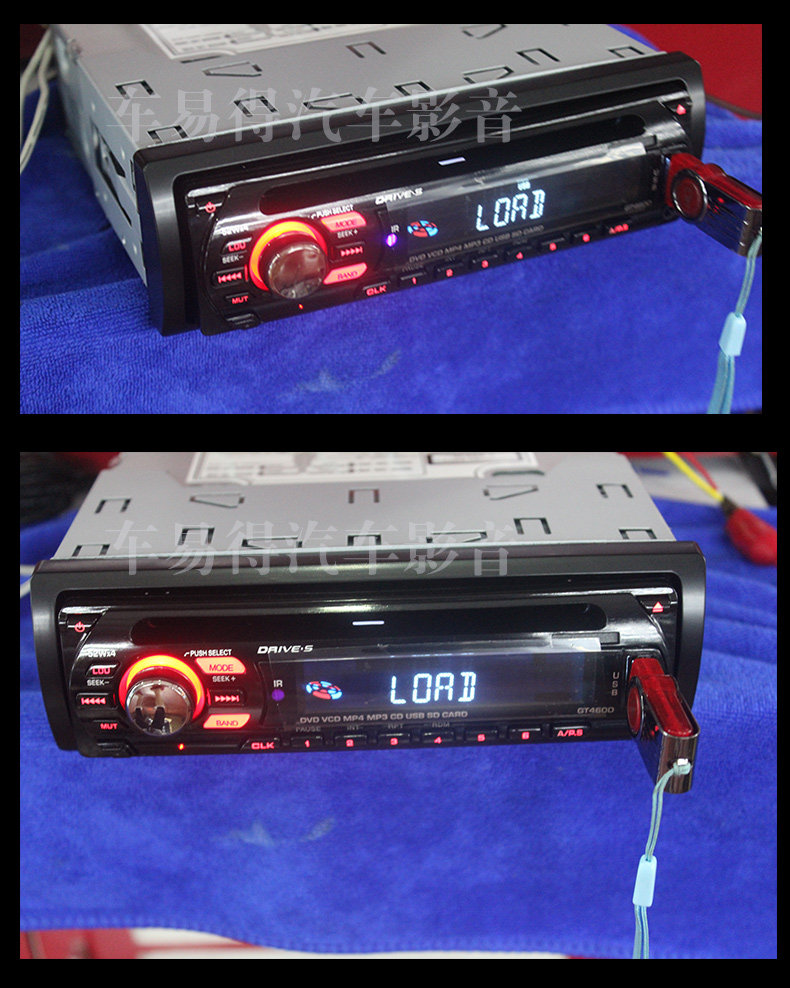 功能说明: ·U盘/SD卡播放 ·最大功率:50瓦特×4 ·兼容CD-R-RW/DVD-R/DVD-RW/MP3/WMA/MP4/DVIX格式 ·兼容MTSC/PAL制式 ·电子防震 ·收音波段FM/AM ·共可储30个电台 ·自动记忆储台、手动扫描 ·音量/平衡/低音/高音/4种音响模式控制 ·红外线遥控 ·视频输出 产品图片: